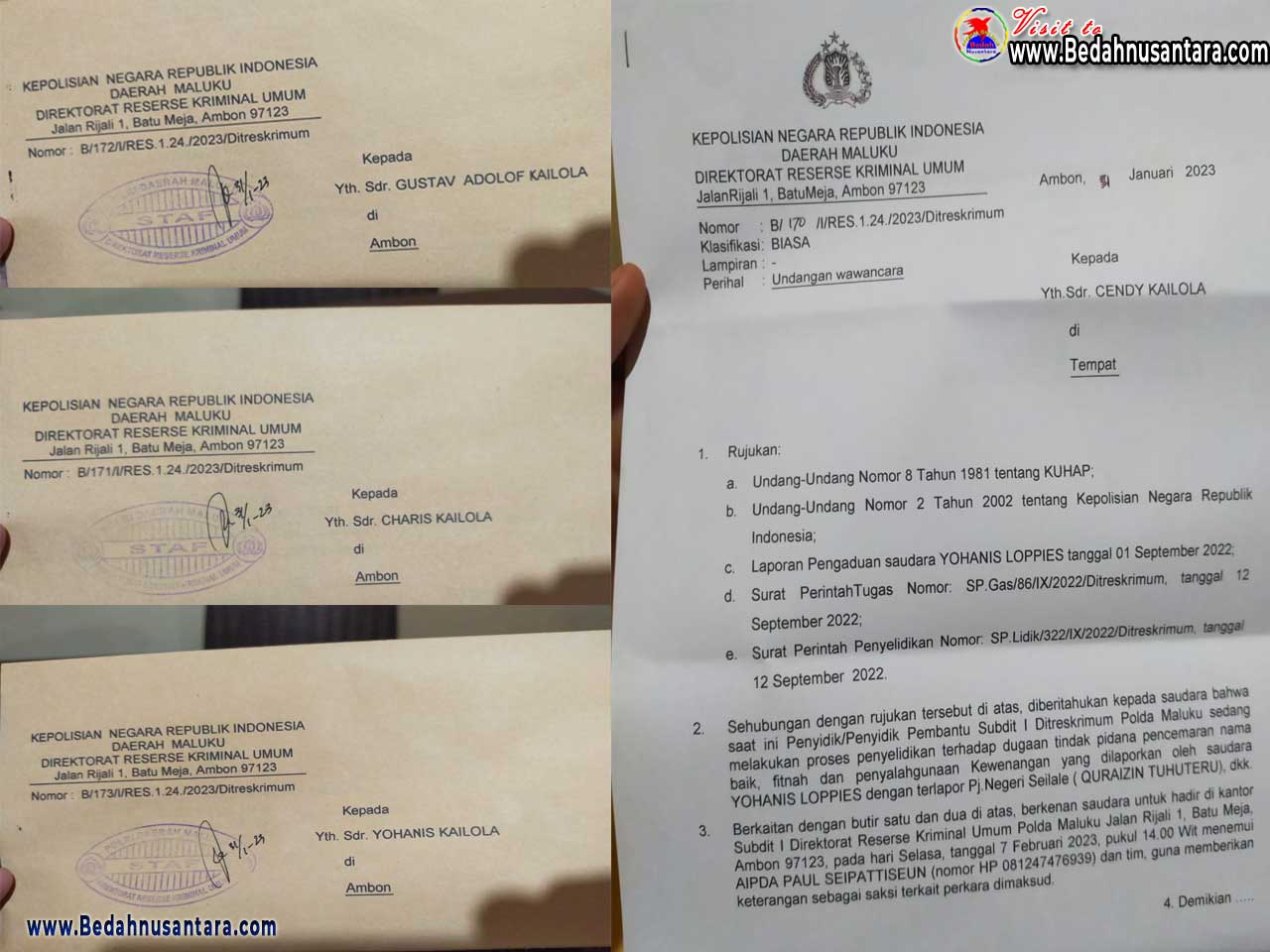 Dan kini langkah hukum yang diambil oleh Mata Rumah Parentah Loppies Seilana Pattinai mendapatkan respon baik dari pihak penegak hukum lingkup Polda Maluku, yang mana berdasarkan data dan informasi resmi yang diterima media ini, Pihak Polda Maluku melalui Direktorat Kriminal Umum akhirnya melakukan pemanggilan terhadap para pelaku yang telah diduga melakukan Fitnah, Pencemaran Nama Baik, Pelecehan Martabat dan Kapasitas dari Mata Rumah Parentah Loppies.