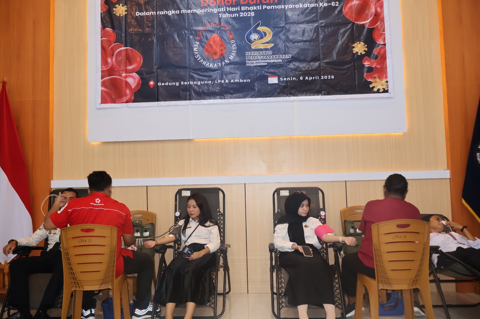 Ambon, Bedahnusantara.com: Lembaga Pembinaan Khusus Anak (LPKA) Kelas II Ambon menggelar aksi donor darah yang diikuti oleh sembilan orang pegawai di Ruang Serbaguna, Senin (6/4). Aksi kemanusiaan ini dilaksanakan sebagai bentuk kepedulian sosial jajaran pemasyarakatan dalam membantu ketersediaan stok darah daerah, sekaligus menyemarakkan peringatan Hari Bakti Pemasyarakatan (HBP) ke-62.