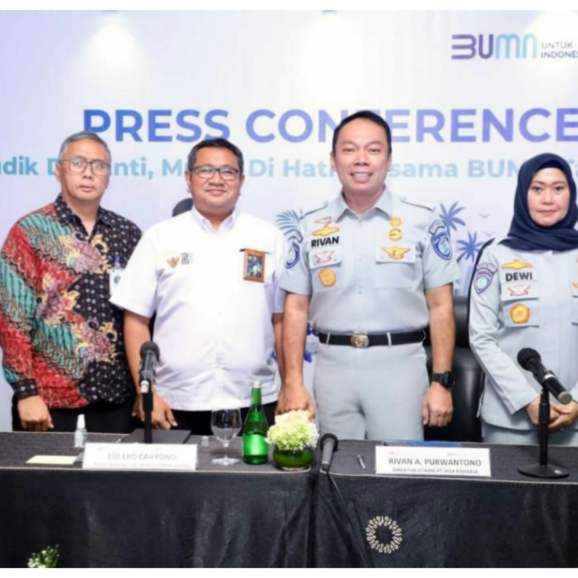 Konferensi pers peluncuran program mudik gratis BUMN 2023 dihadiri Asisten Deputi TJSL, Kementerian BUMN, Edi Eko Cahyono dan Direktur Utama Jasa Raharja Rivan A. Purwantono selaku PIC program tersebut di Bandung, Jawa Barat .