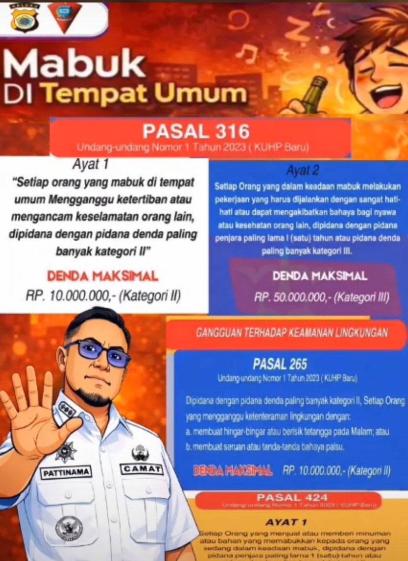 Ia mencontohkan salah satu ketentuan yang perlu dipahami bersama, yakni Pasal 316 KUHP, yang mengatur tentang larangan mabuk di tempat umum apabila mengganggu ketertiban atau membahayakan keselamatan orang lain.